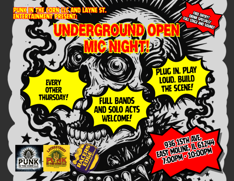 Punk in the Corn LLC and Layne Street Entertainment are partnering with Racers Edge to bring an Underground Band Open Mic Night every other Thursday. This is for local bands who want stage time. Originals. New material. First shows. No drama. Just music.
