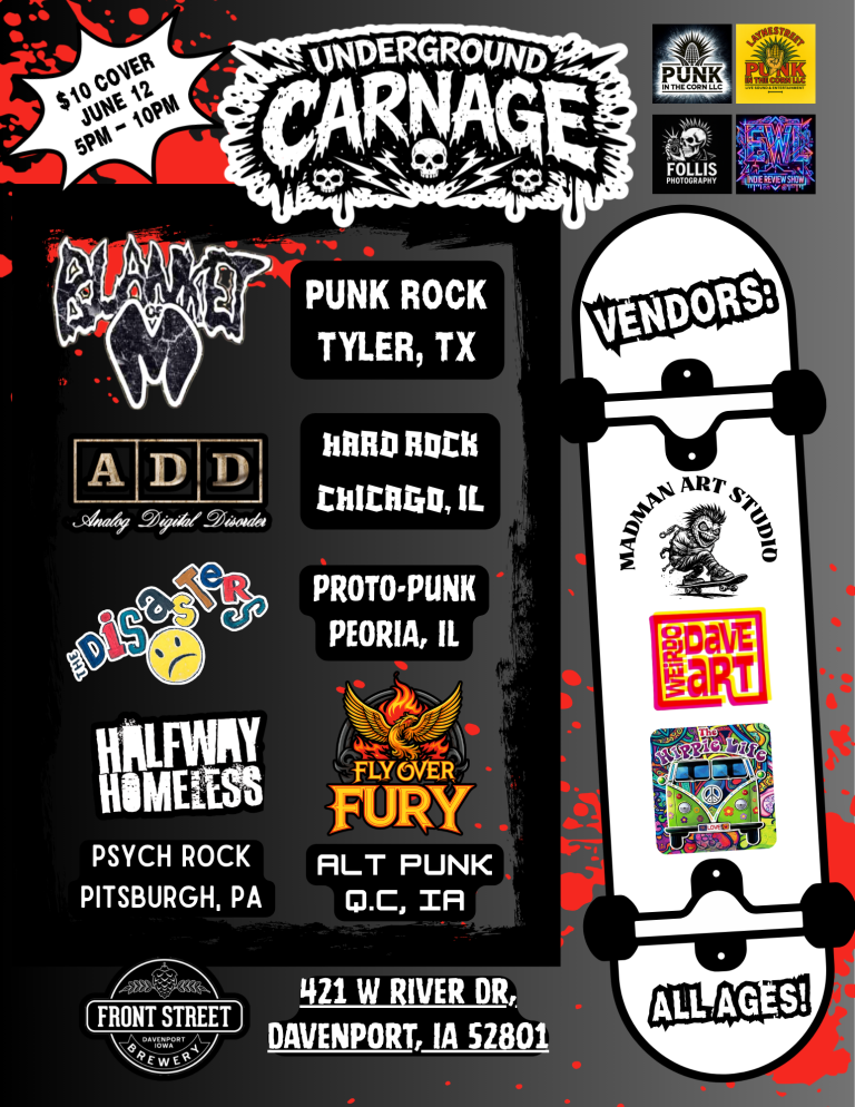 This isn’t your average summer fest — it’s two full days of peace, punk, and pure chaos in the Midwest heartland. One stage, 30+ bands, camping, food, beer, art, and enough raw energy to wake the cornfields from the dead.