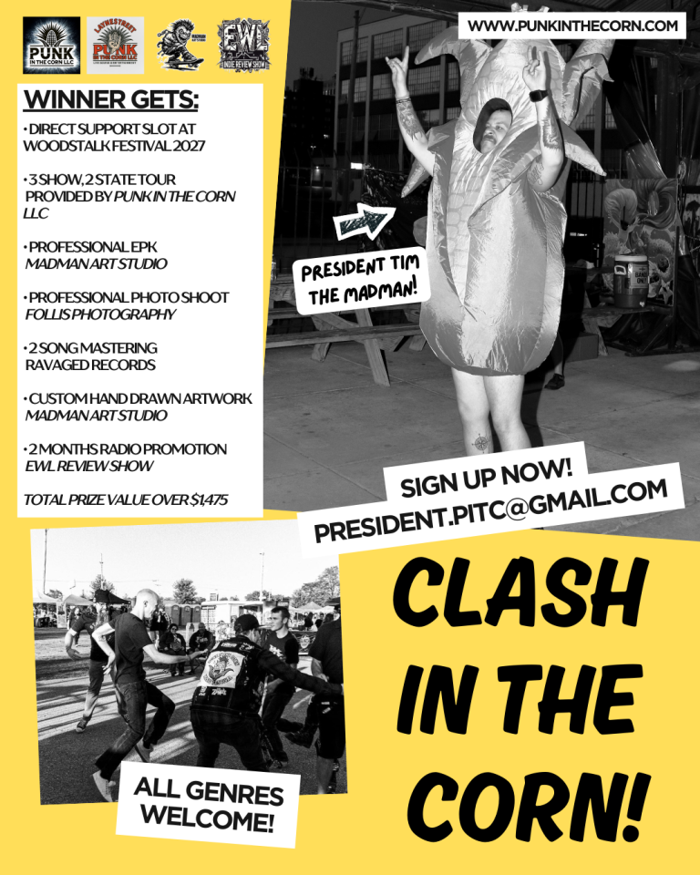 Clash in the Corn is your shot to rise through the underground and take the stage in a big way. One band will earn a direct support slot at Woodstalk Festival 2027, a 3 show two state tour, professional EPK, photo shoot, custom artwork, mastering from Ravaged Records, and two months of radio promotion on the EWL Review Show.
